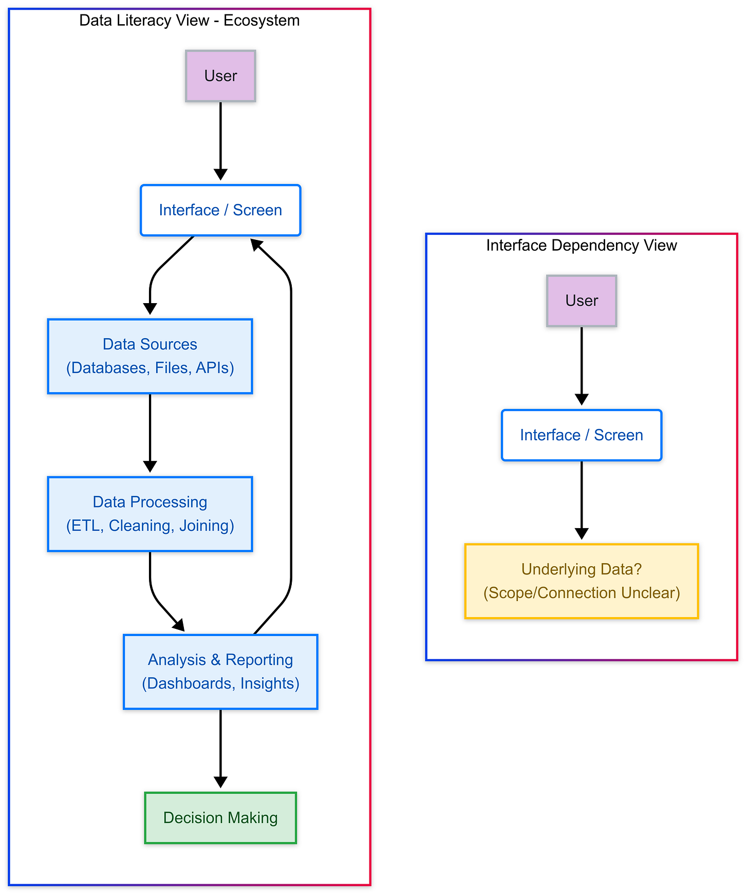 The 'Interface Dependency View' depicts the limited understanding where a user interacts with a screen, but the underlying data sources and processes remain obscure. In contrast, the 'Data Literacy View' shows a user interacting with an interface while understanding it connects to data sources, which are then processed and analyzed to generate reports and insights that ultimately inform decision-making and feed back into the system."