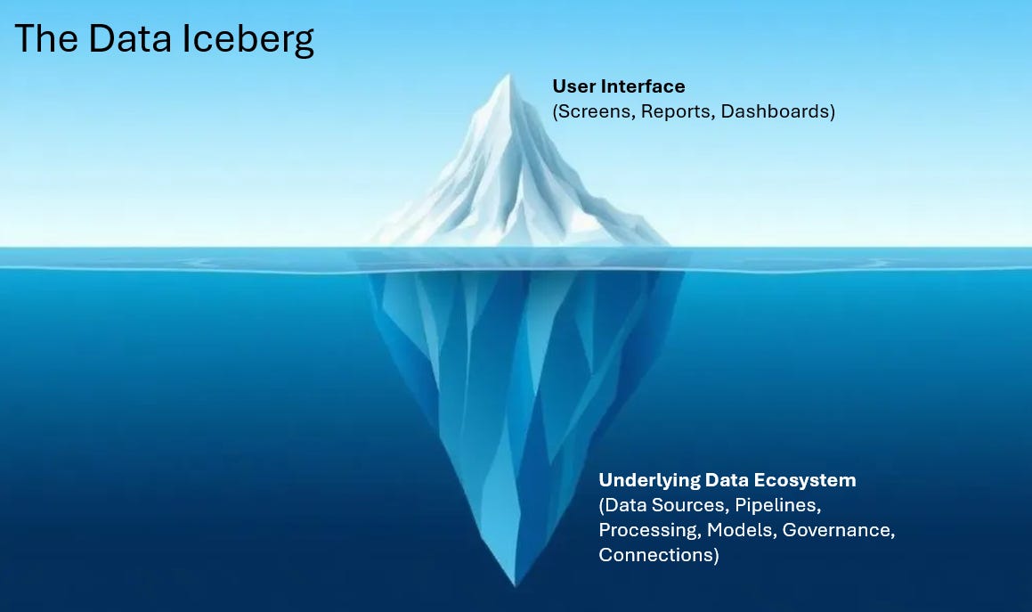 This "data literacy gap" sometimes manifests as what I call "interface dependency,” a Systems Thinking failure where employees interact only with isolated components (screens and reports) rather than conceptualizing the interconnected information ecosystem that powers them. While users may become comfortable with the business meaning of the data presented in a specific UI or report, they often miss the valuable context of its underlying structure and how it connects within the broader information ecosystem. They see the parts, not the whole system, limiting their ability to adapt to new tools or envision new possibilities for the organization's data assets. As technology races ahead, this lack of foundational understanding means business adoption of powerful new tools frequently trails behind. The common "Data Iceberg" metaphor (Figure 1) aptly illustrates this hidden complexity.