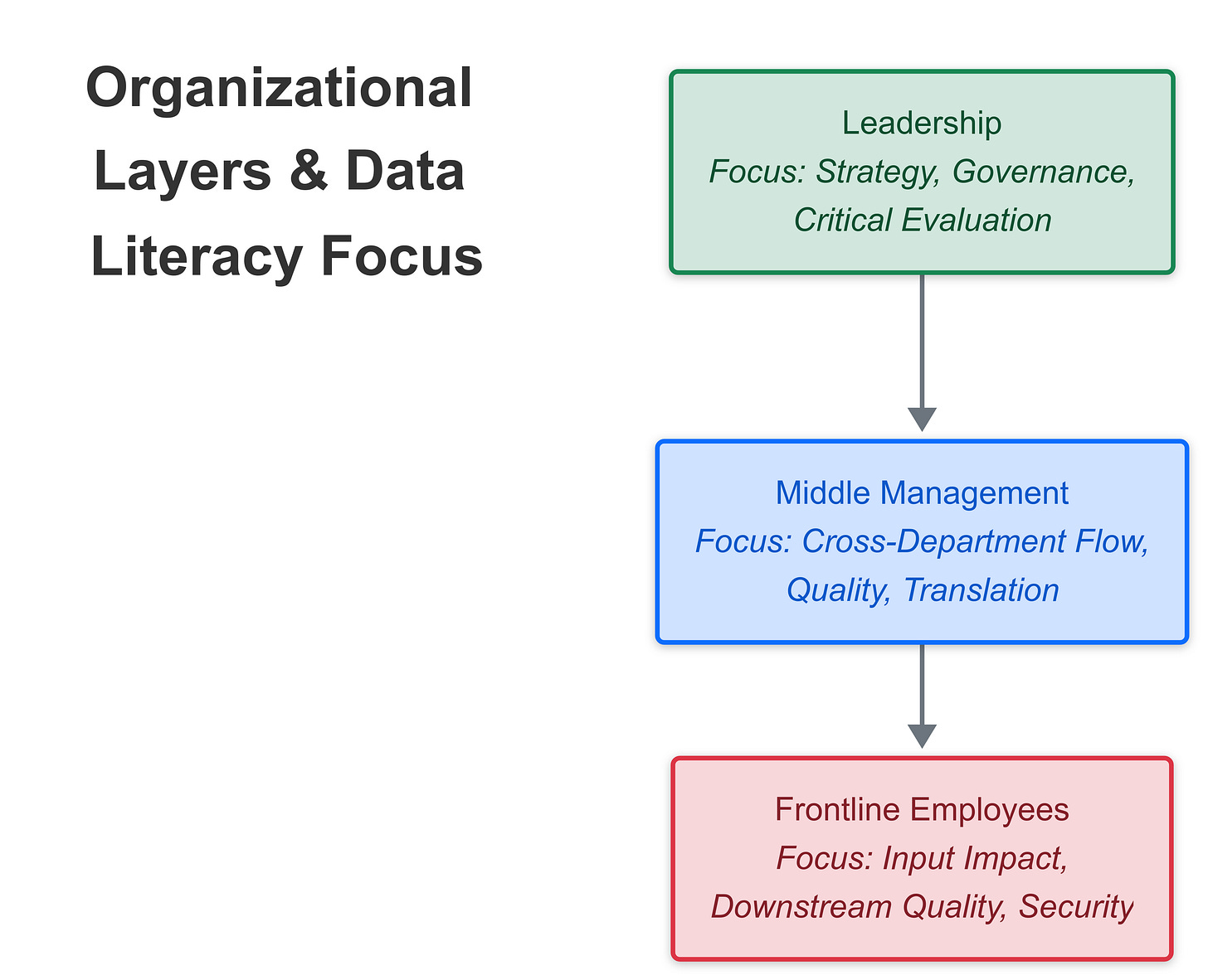 Effective data literacy initiatives cannot be one-size-fits-all; they must be tailored to different organizational roles. For Leadership, the focus should be on understanding data as a strategic asset, grasping governance requirements, and developing the capability to critically evaluate data-driven recommendations. Middle Management plays a crucial bridging role, needing to emphasize data flow across departmental boundaries, develop skills to identify data quality issues, and build the capability to translate business needs into data questions. At the Frontline, employees benefit most from understanding the direct connection between their inputs and the organization's data assets, recognizing how data quality affects downstream processes, and building awareness of essential data security and privacy requirements.